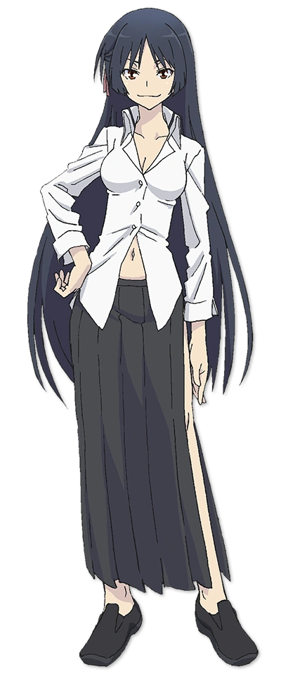 On the right side of her head, a small red ribbon is tied to several strands of her hair. For her normal attire, Akio wears a white long sleeved button-up shirt that exposes her cleavage, stomach and navel, a long dark skirt with double slits revealing the both sides of her legs and a pair of dark slip-on shoes.